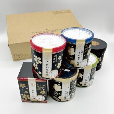 日本製の高級綿棒『こだわり綿棒シリーズ(全5種)』と詰替用缶容器を全てセットにしました。